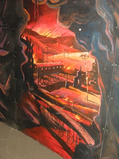 Another corridor awaits, and at the end..... it's Hell, ladies and gentlemen - our journey to hell is at an end - here it is in all it's glory.... lovingly painted in the recent refurbishment. This mural is so detailed that you need to ride the ride several times to get all the fine detail in it. |