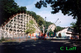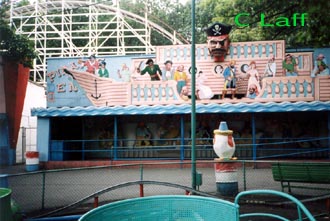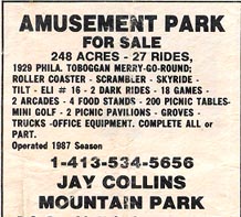 I'm not too sure why I ventured into Mountain Park on one fine Hot Summer Day circa 1984, but whatever the reason, this was "The" Park that started my Love Affair with Dark Rides. Maybe it was the sinister facade of the "Dinosaur Den " or the funny looking Pirates on the "Pirates Den" front, whatever the reason, it was here and nowhere else that started a hobby that now has lasted 18 plus years. Mountain was MY park, period. I had free run there as Walter, the parks General Manager took a strong liking to this skinny little Teenager who asked way too many questions about the parks Dark Rides, so much in fact that I was bum-rushed out of the office door and into Roger Fortin's hands to appease all my curiosity. To a 17 year old, the words such as "Pretzel" and "Hot Rail" and "Air-operated prop" were sheer magic, and the beginning of learning the Holy Grail of Knowledge, the so called: "Keys to the Kingdom". I would go onto bother Roger and Walter so much that I began to have free run of the park, fist full of free ride tickets, access to areas the general public would never get to see, in a nutshell, superstar treatment for this young man who would get so much pleasure out of something he was only starting to understand, but would crave more knowledge of. |